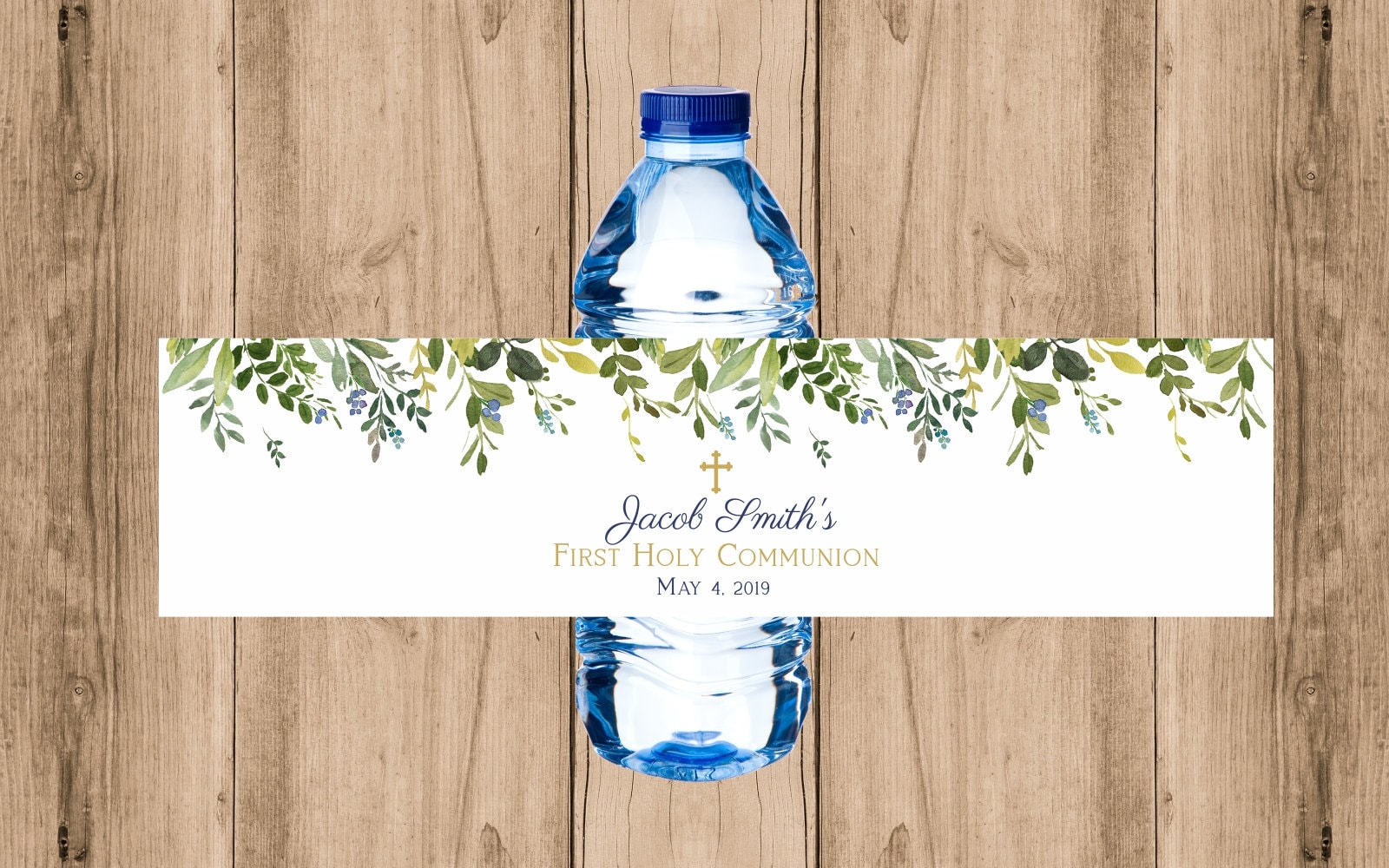 Water bottle labels First Communion, navy boy first Communion, personalized printable label, Greenery, baptism